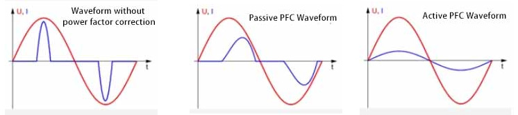 The three pictures are the effect of power factor correction. Red is the input voltage, blue is the input current. The first picture is the waveform without power factor correction. The second picture is the waveform with passive power factor correction. And the third picture is the waveform with active power factor correction.
